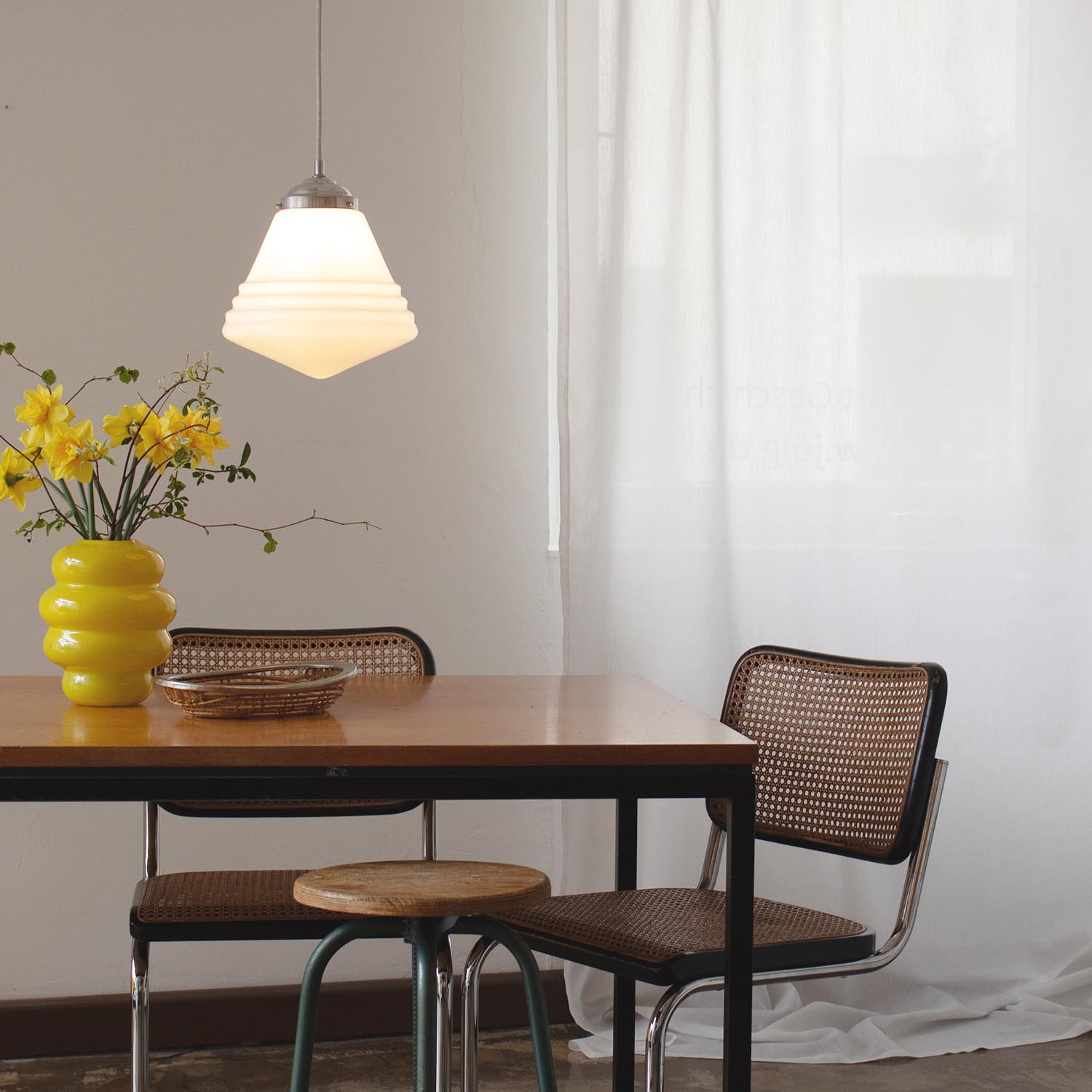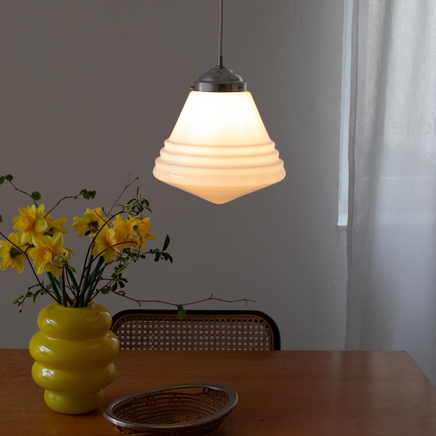 Deine einzigartige Opalglas-Leuchte ist eine sehr ausdrucksstarke getreppte Opalglasleuchte aus dem Hause Siemens, die euch blendfrei umfassendes Licht spendet. Tolles und sehr seltenes Stück Zeitgeschichte. Die konisch zulaufende Form mit dem getrepptem Abschluss sind typische für das Modell von Siemens.