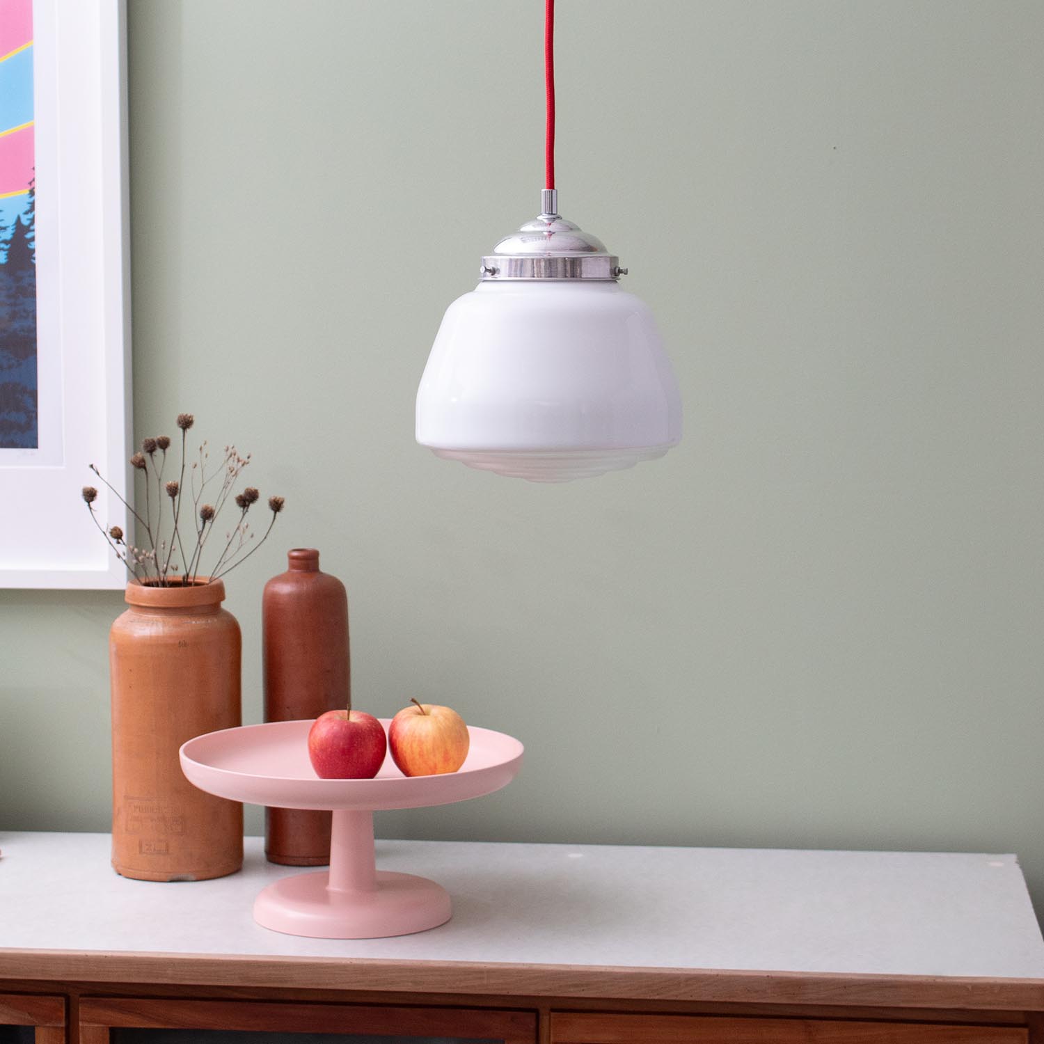 Kleine Opalglasleuchte für stilvolles Akzentlicht.Opalglas (auch Kryolithglas genannt) sieht aus wie milchiges oder satiniertes Glas, mit dem Unterschied, dass Opalglas mehr Glanz hat. Opalglas ist ein lichtdurchlässiges, aber nicht durchsichtiges Glas. Das durchscheinende Licht ist sanft und blendet nicht. Opalglas erreicht somit eine gleichmäßigere Lichtbrechung/Streuung als bei der Verwendung von normalem Glas. Mit Opalglas versehene Leuchten wurden bis ca. 1920 nur im industriellen Bereich eingesetzt. 1923 entwarfen die beiden Produktdesigner Wilhelm Wagenfeld und Carl Jakob Jucker in der Metallwerkstatt des Weimarer Bauhaus die erste Leuchte, die durch das verwendete Opalglas gestreutes Licht auch in den Wohnraum brachte. Die „Bauhaus-Leuchte“ ist heute besser bekannt als „Wagenfeld-Leuchte“ und zählt zu den Designklassikern des 20. Jahrhunderts. Seit diesem Zeitpunkt hat sich opales Glas – vor allem im späten Art déco - über viele Epochen und Stile hinweg bis heute als modernes und vielseitiges Glas im Leuchtendesign etabliert.