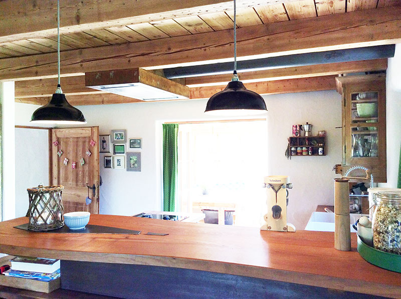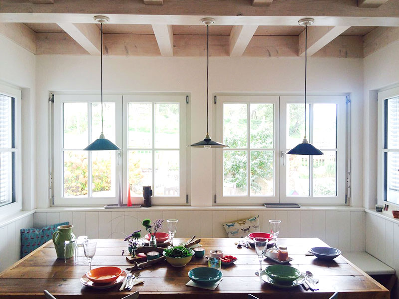 Der farbig emaillierte Schirm einer Werkstattlampe hängt harmonisch über dem Ess- oder Küchentisch im Landhaus-Look.