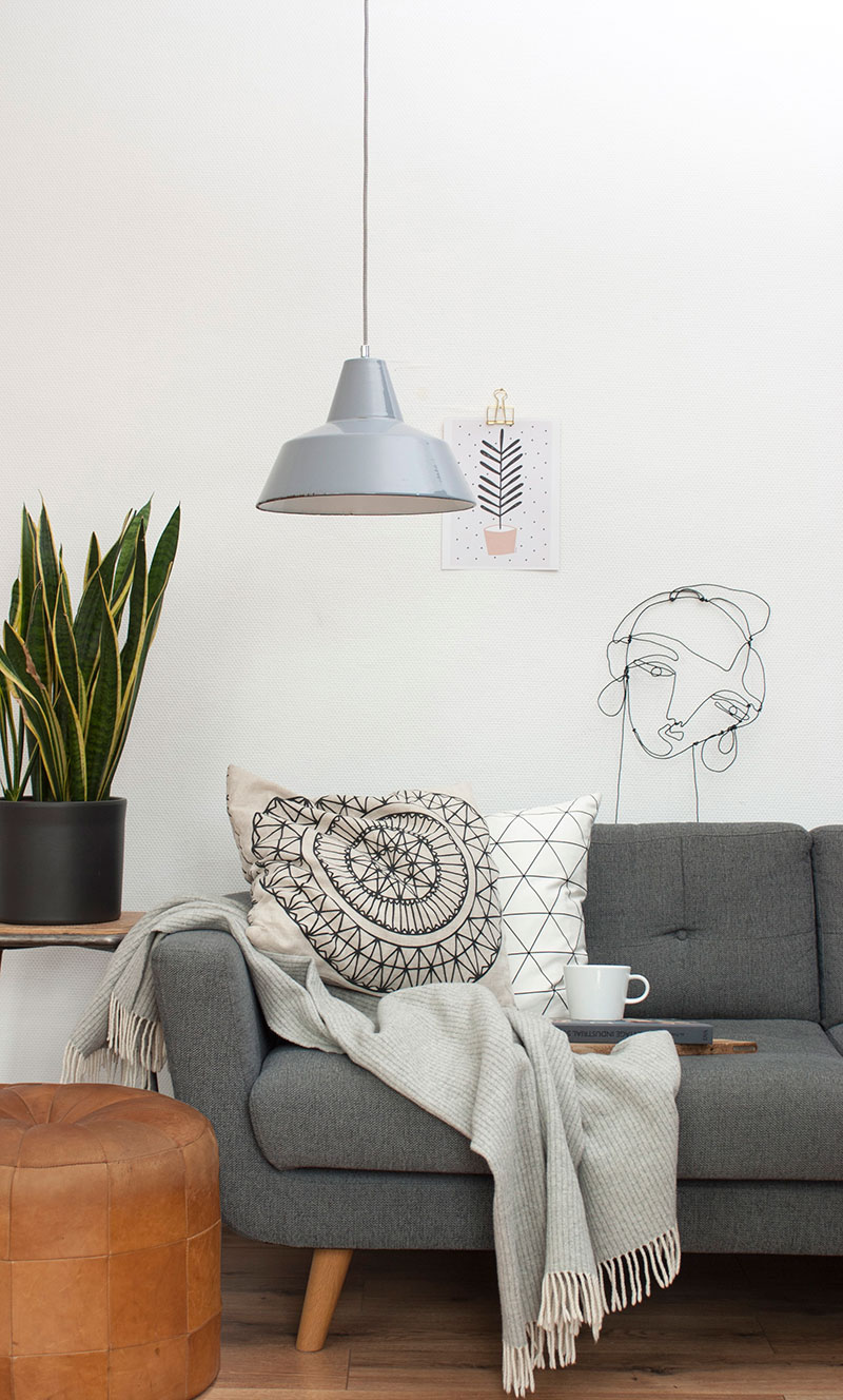 Boho- oder eklektische Einrichtungen verlangen geradezu nach einer aussagekräftigen Beleuchtung. Zum warmen Holz des Midcentury Designs setzt eine Industrielampe aus emailliertem Stahl tolle Akzente.