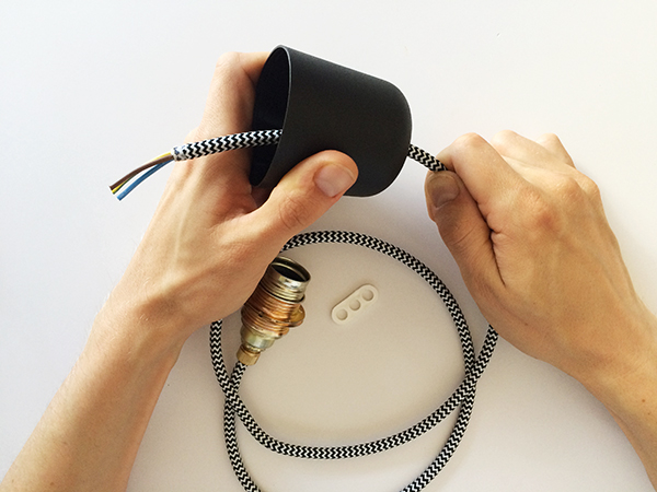 2. Nachdem das Kabel die richtige Länge hat und abisoliert ist, müsst ihr den Baldachin mit der großen Öffnung in Richtung Kabelende über das Kabel schieben. Hierzu braucht ihr ein wenig Druck. Die Öffnung mit der Zugklammer ist recht eng, da sie ja später den Baldachin "festklammern" soll.