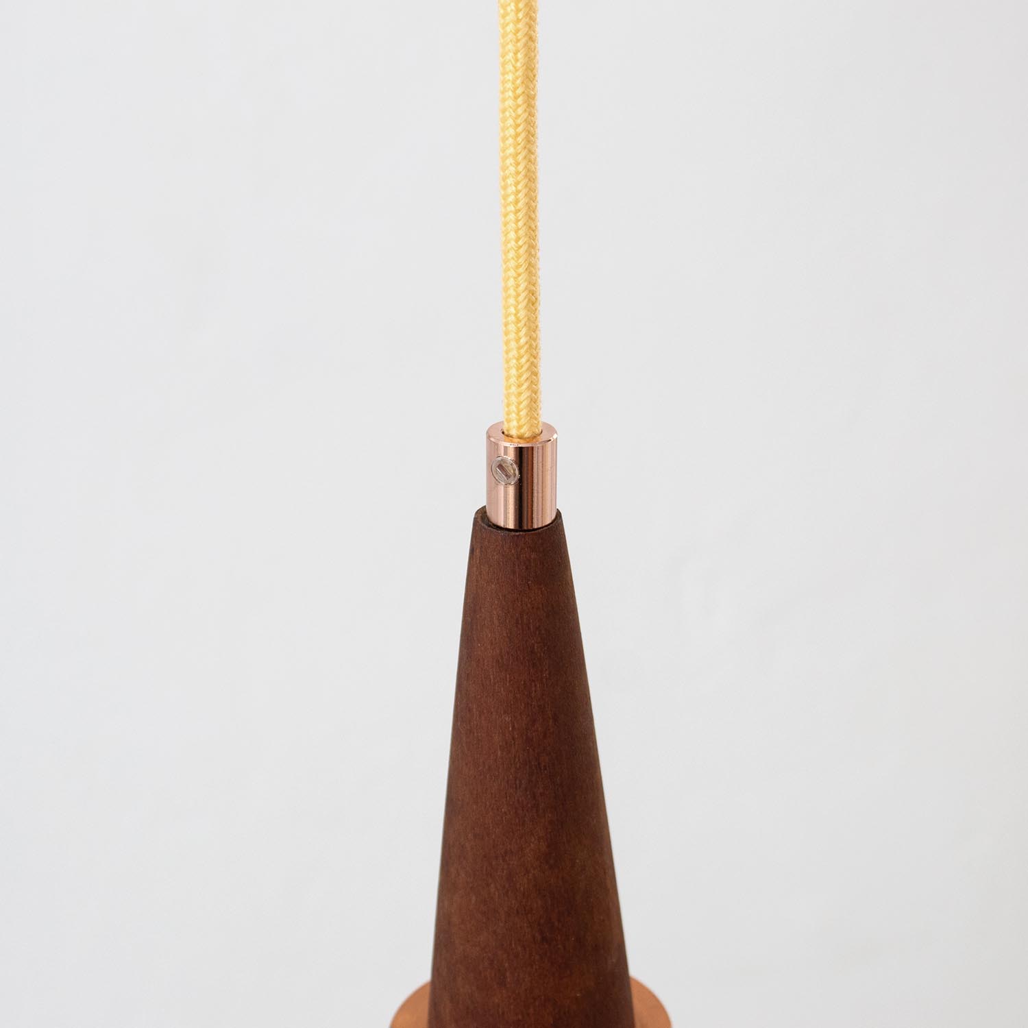 Schlichte micentury Pendelleuchte mit Teak-Element aus den 1960er Jahren. Um die Leuchte zum individuellen Designstück zu machen, kannst du sie mit einem bunten Textilkabel nach deinen Vorstellungen gestalten. Wähle einfach ein Kabel aus und bestimme zusätzlich dessen ideale Länge anhand deiner Gegebenheiten vor Ort.