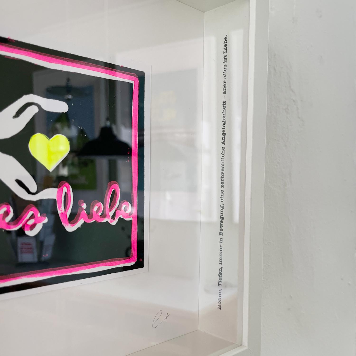 Edition 2/50 - Höhen, Tiefen, immer in Bewegung, eine zerbrechliche Angelegenheit – aber alles ist Liebe. Der einzigartige und unperfekte Linoldruck unterstreicht die vielfältigen Ausdrucksweisen von Liebe. Kantig, etwas „ver-rückt“, mal bunt, mal tiefschwarz doch immer mit Sorgfalt und Fingerspitzengefühl zu behandeln.