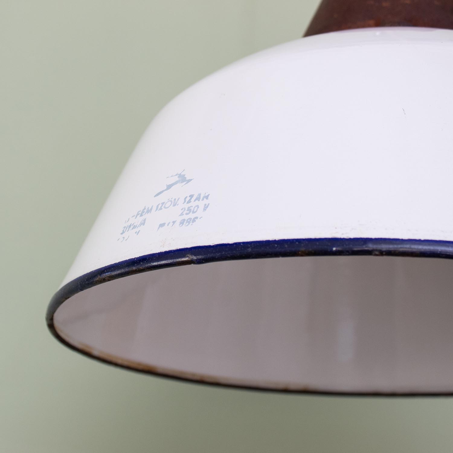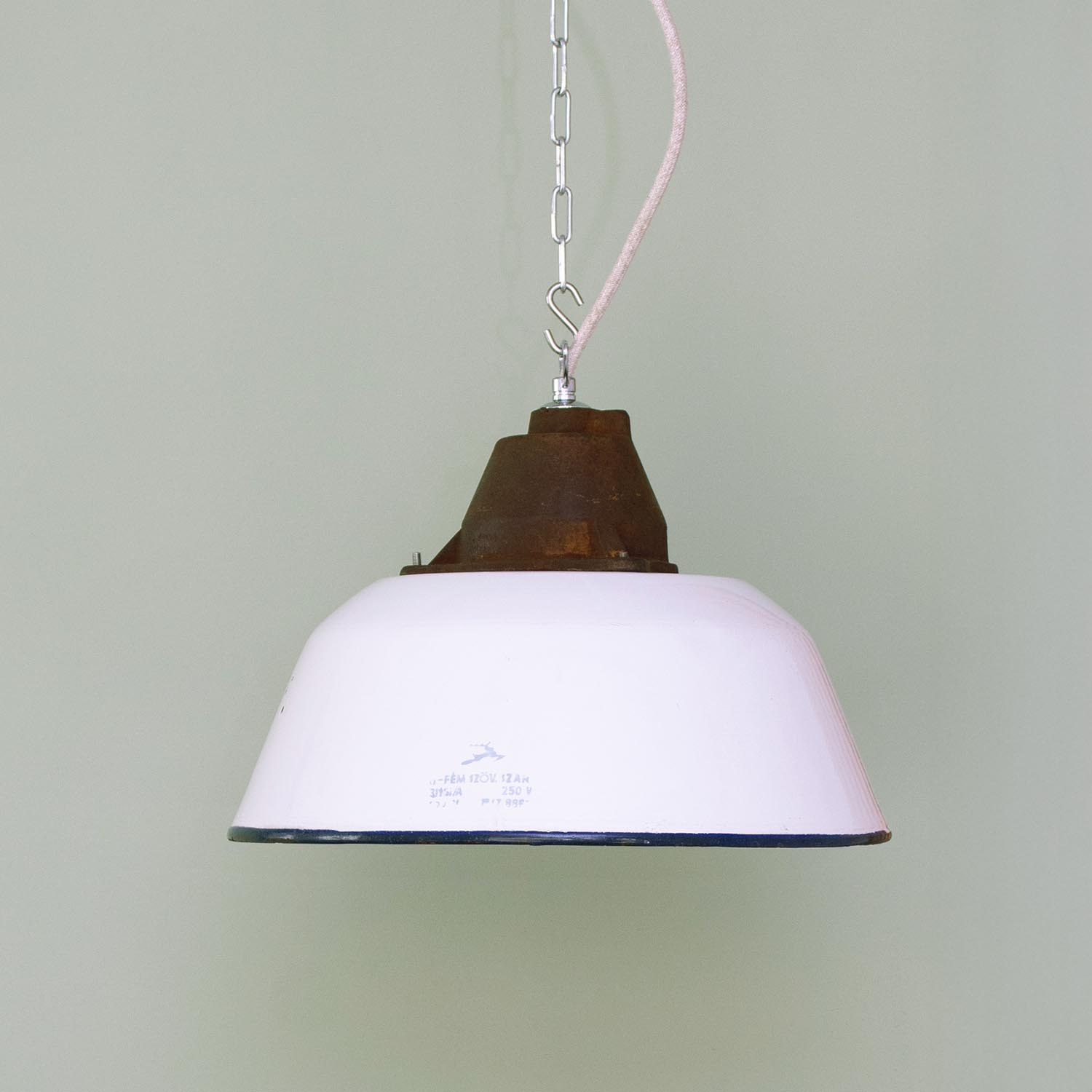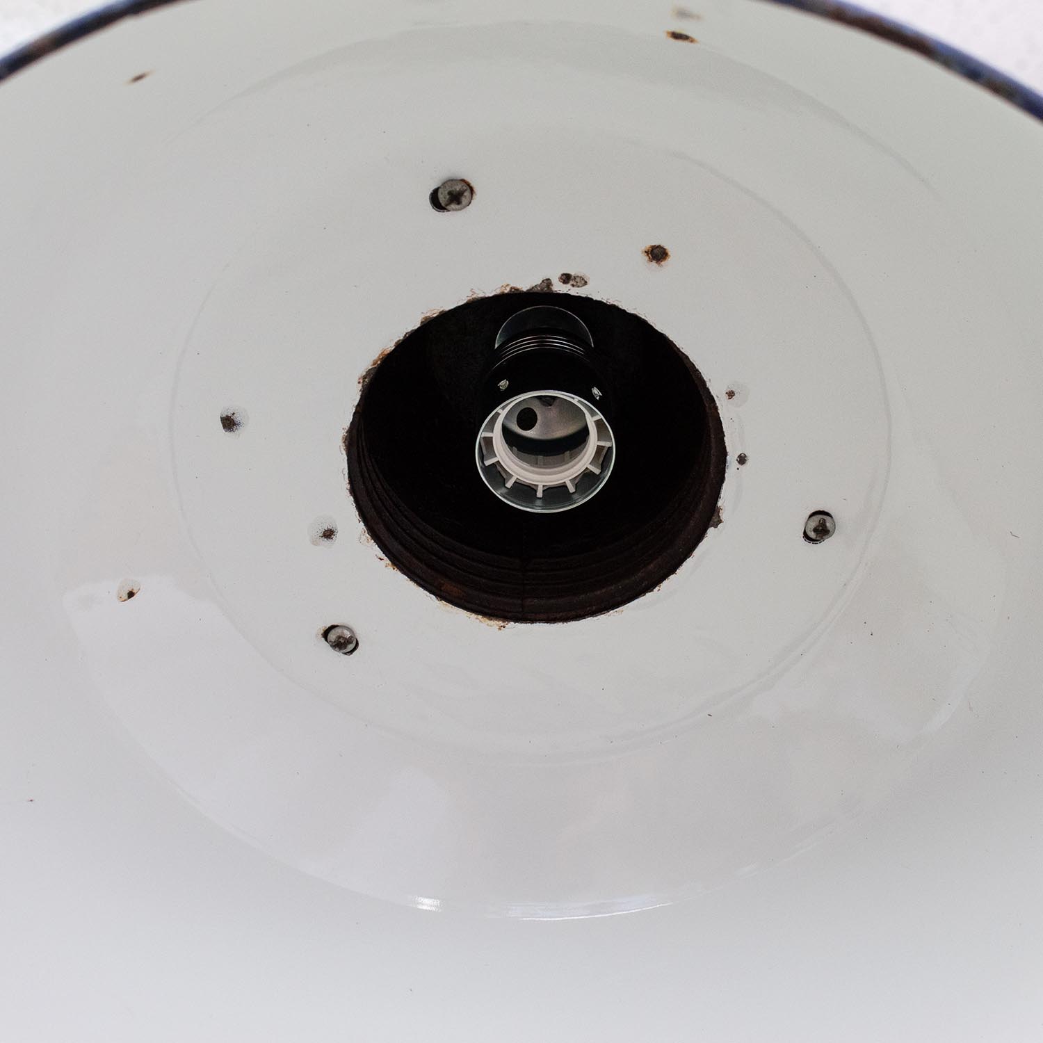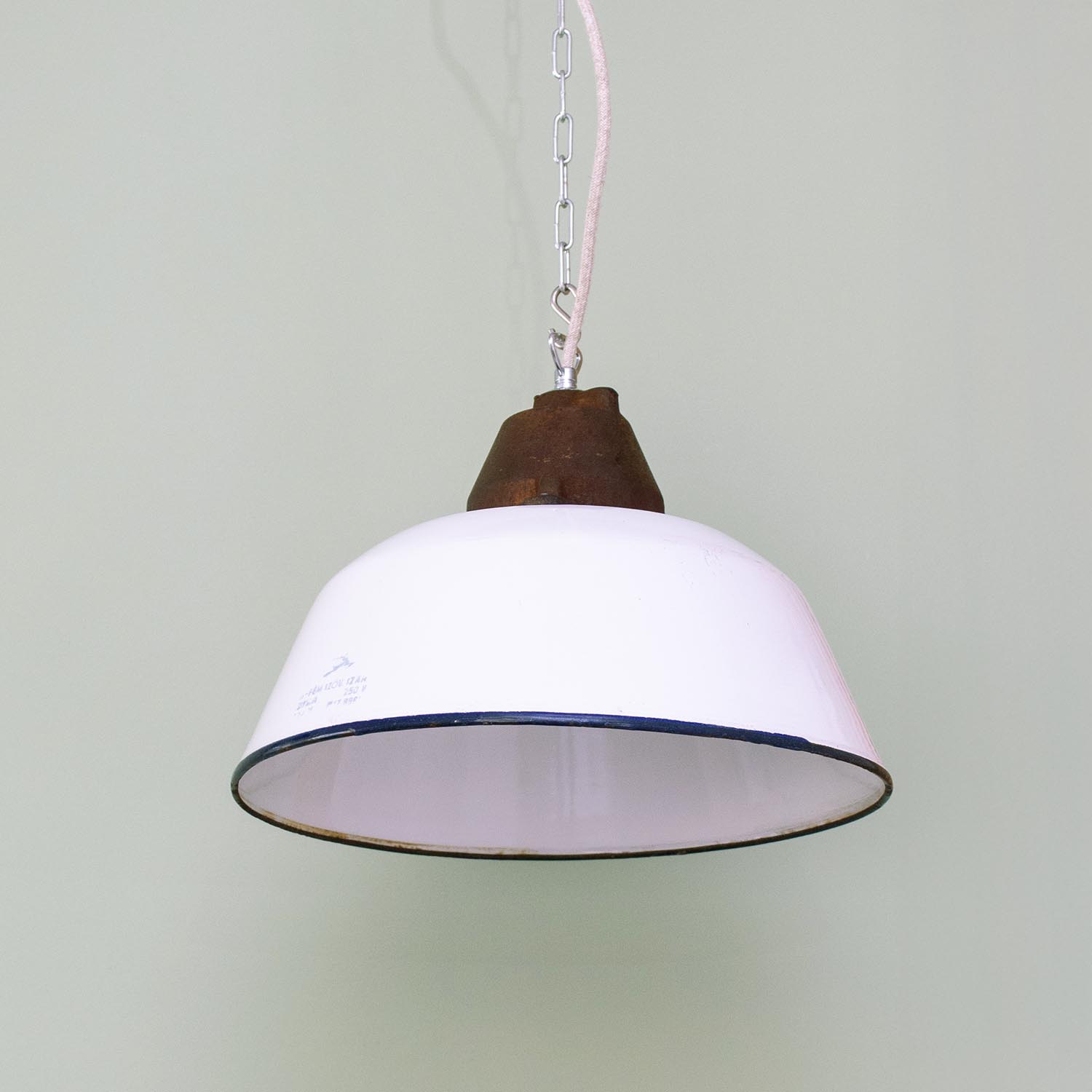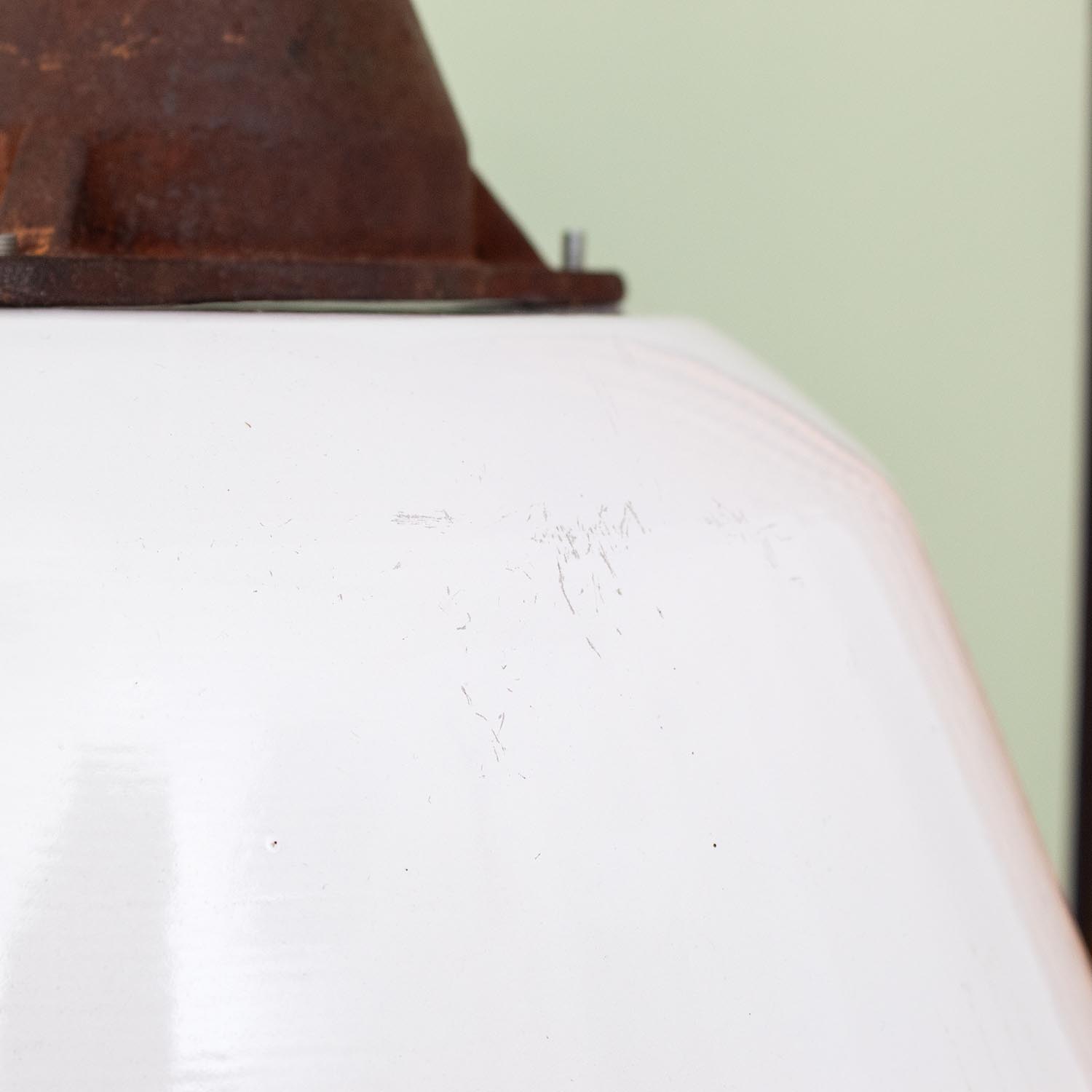 Diese Lampen wurden ursprünglich zur Beleuchtung von Montagehallen und Werkstätten konzipiert, so sorgten Sie ursprünglich für eine gleichmäßige Ausleuchtung von Arbeistbereichen. Durch die weiße Emaillierung im inneren der Leuchte wird dieser Effekt nochmals verstärkt. Jeder Lampenschirm ist ein Unikat und weist eine unverwechselbare Patina auf.