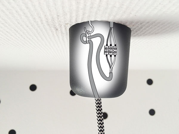 Sollte sich der Stromanschluss nicht direkt unter der Stromquelle befinden, kannst du so deine Lampe ebenfalls sicher aufhängen. Achte bei deiner Bestellung darauf ein längeres Kabel zu wählen, damit es bis zum Stromanschluss reicht.