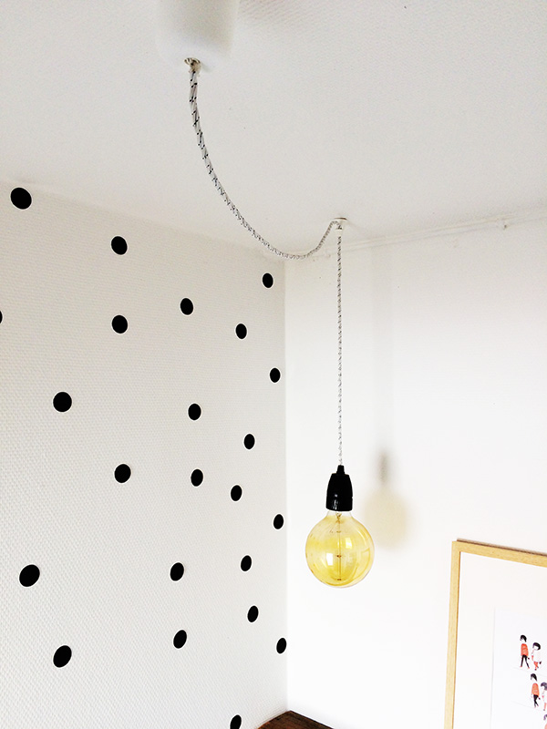 Die Lampe hängt nicht direkt unter dem Stromanschluss und wird mittels „Affenschaukel“ aufgehängt.