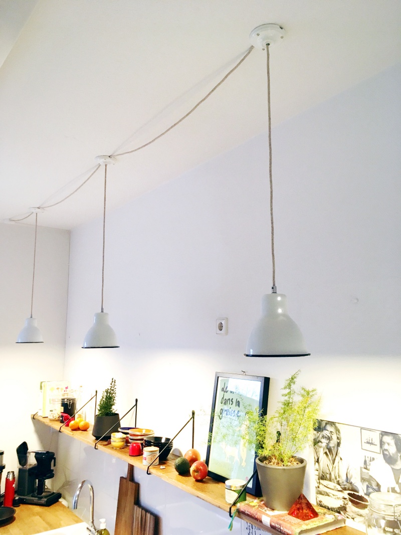 Ihr könnt z. B. von eurem Stromanschluss mittels Affenschaukel zu einem Abzweigbaldachin leiten. Von diesem aus können dann wiederum mit einer Affenschaukel, WAGO-Klemmen und Distanzaufhängungen die entsprechenden Hängelampen angesteuert werden.